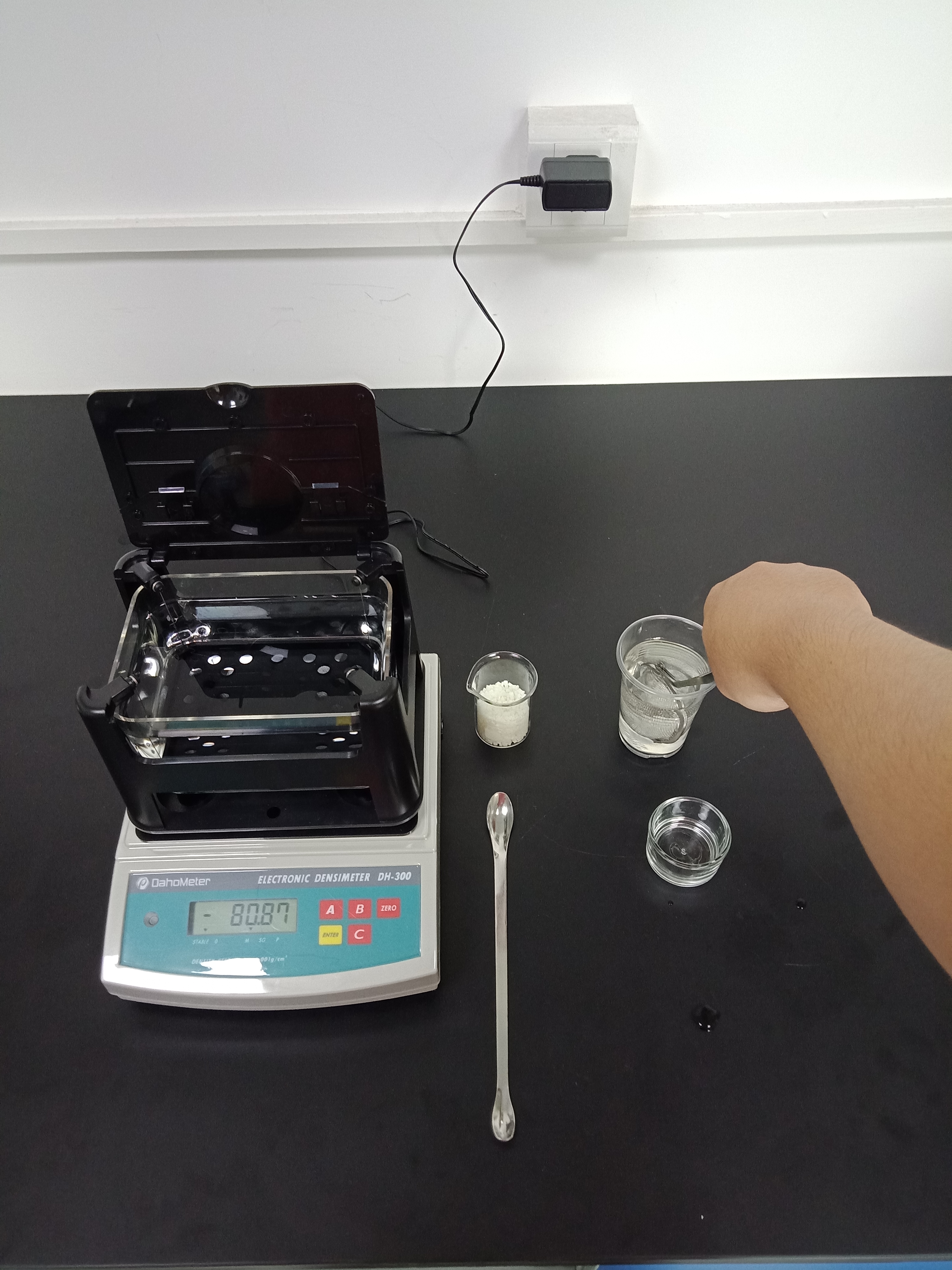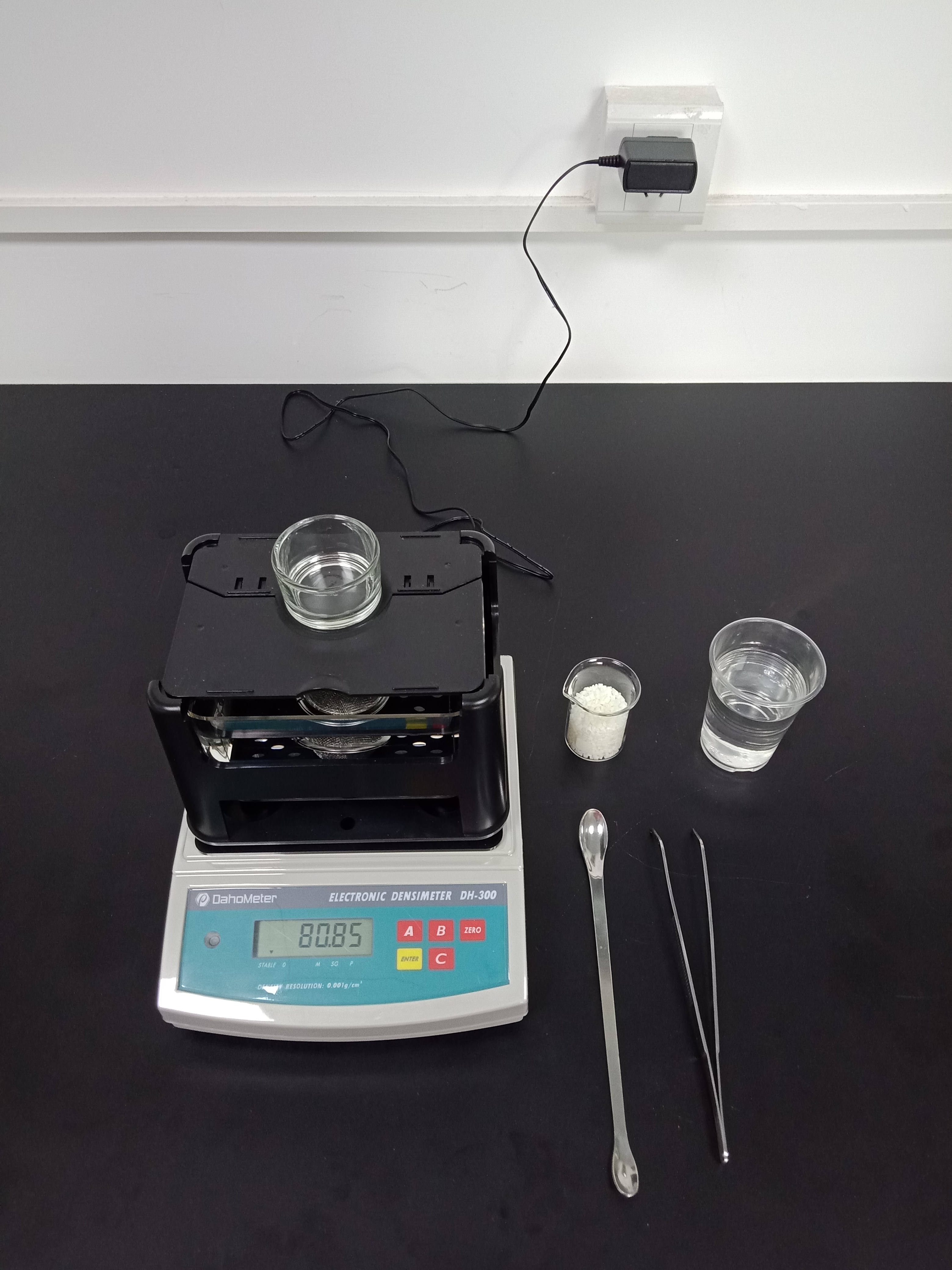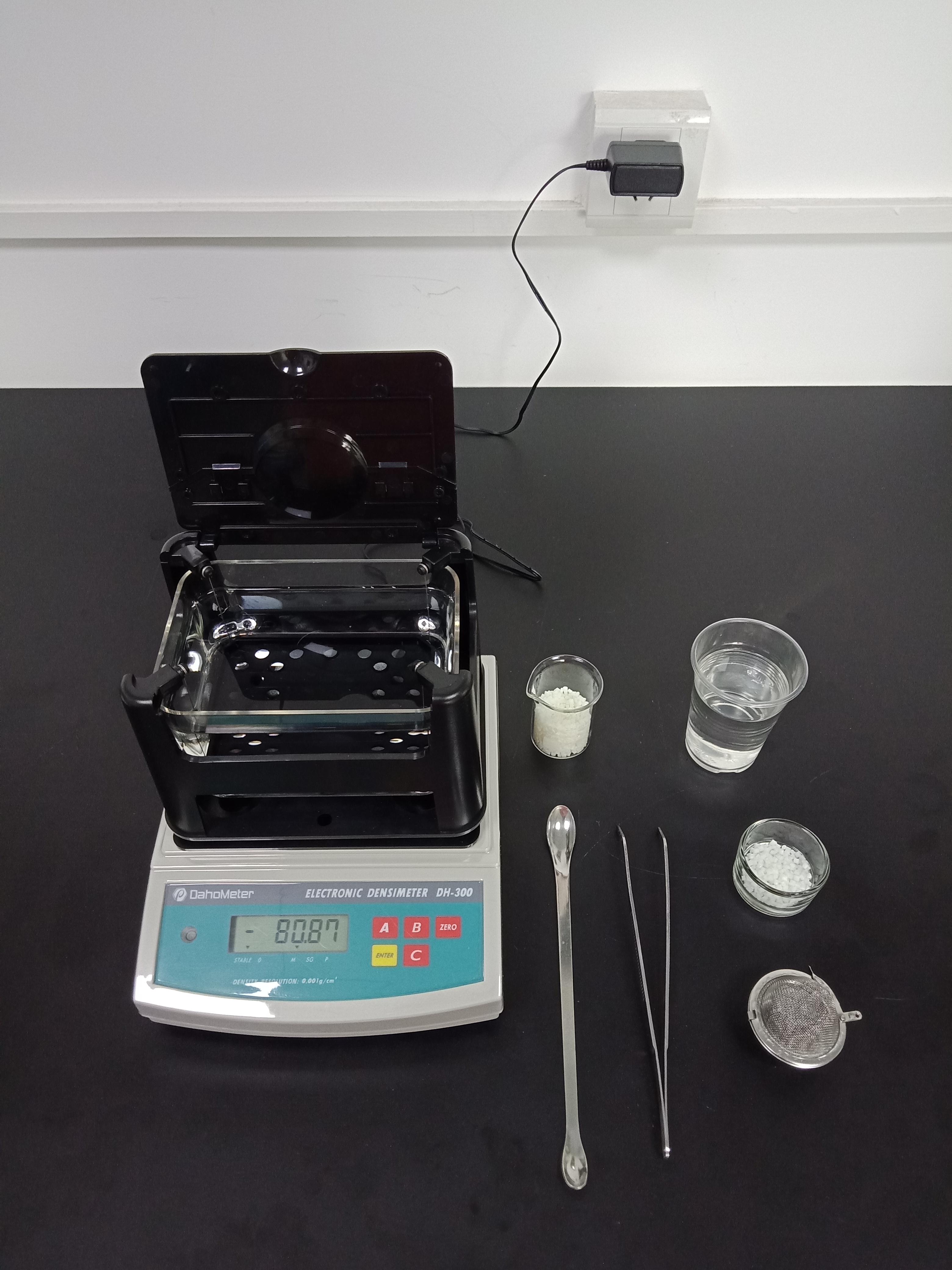 1,準備好測試儀器DH-300,測試樣品和測試工具小玻璃杯一個,小網球一個,鑷子一把,勺子一個,裝滿酒精的杯子一個
